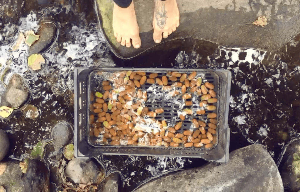 1b- Soak them in the river (or other running water source) using a box or a net for about 5 days.